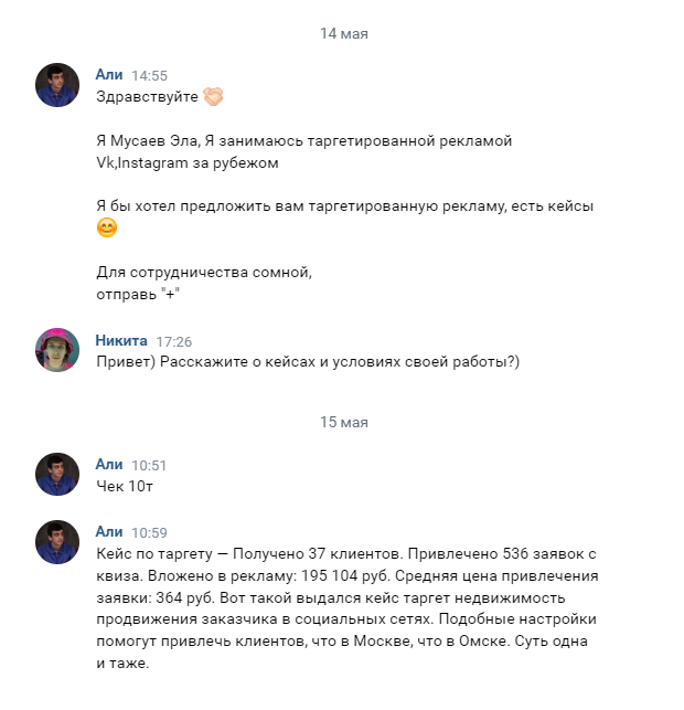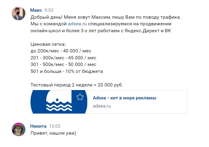 "Никита - расслабься. Я в этом деле собаку съел так что все будет хорошо. Я полностью закрою вопрос трафика - протестирую все возможные объявления для всех возможных категорий потенциальных клиентов - это займет 5 дней и 30 000 бюджета на трафик. После этого я выберу самые рабочие гипотезы и масштабирую их до тех бюджетов, которые нужны тебе. Стоимость моей работы на проекте - 50 000 рублей"